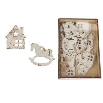 Sada dekoračních vánočních přízdob.Sada obsahuje 24 přízdob.Rozměry : 3 - 3,5 x 0,2 cm, výška 3 cm.Barva : kombinace bílá se zlatou.Materiál na bázi dřeva. číst celé