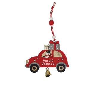 Dekorace k zavěšení - autíčko.Rozměry : 9,3 x 0,5 cm, výška 8 cm, celková délka 16 cm.Barva : kombinace červená, šedá, bílá, černá.Materiál na bázi dřeva. číst celé
