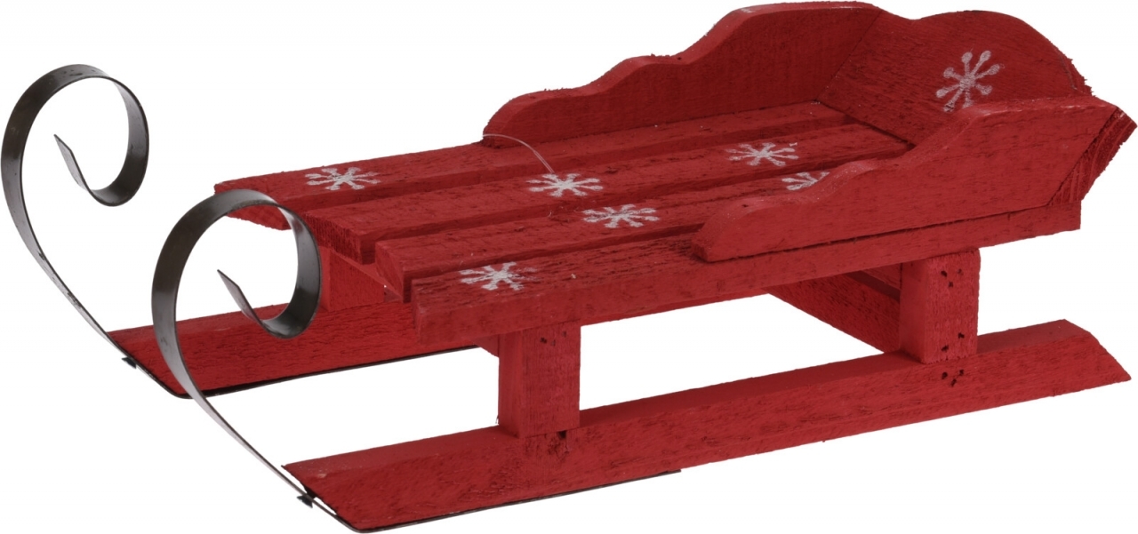 Dekorativní dřevěné červené sáně zdobené bílými vločkami.