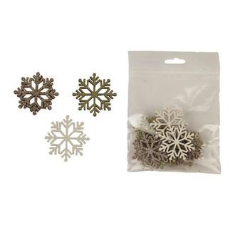 Sada dekoračních vloček.Sada obsahuje 12 vloček.Rozměry : průměr 4 cm, tloušťka 0,2 cm.Barva : kombinace bílá, zlatá, zelená.Materiál na bázi dřeva. číst celé