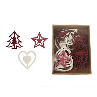Sada dekoračních přízdob.Sada obsahuje 24 přízdob.Rozměry : 3,5 x 0,3 cm, výška 3,7 x 4 cm.Barva : kombinace červená, vínová, bílá.Materiál na bázi dřeva. číst celé
