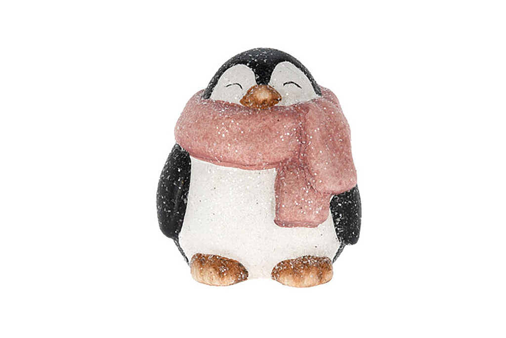 Bytová dekorace z pálené hlíny posypaná umělým sněhem. Vystavte si tohoto roztomilého tučňáka ve své domácnosti. Přibližný rozměr 8 x 6 cm. Materiál: pálená hlína.