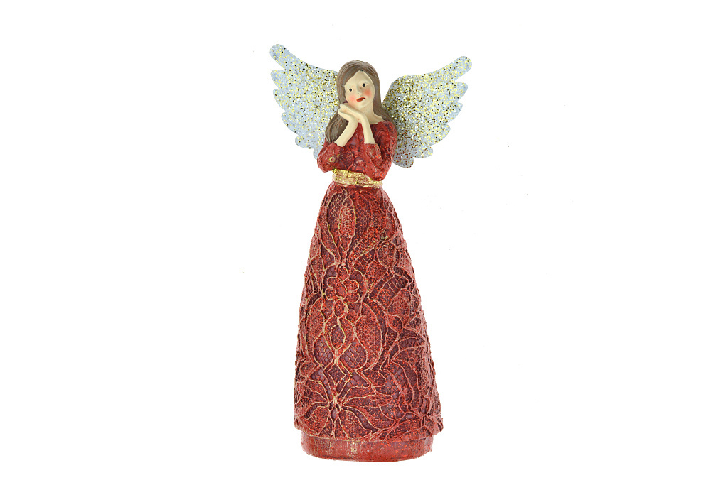 Krásná dekorativní figurka anděla se založenými rucemi pod tváří. Dekorace je vyrobena z plastové hmoty a křídla jsou z plechu opatřeného třpytivými glitry. Celková výška dekorace je přibližně 14,5 cm.