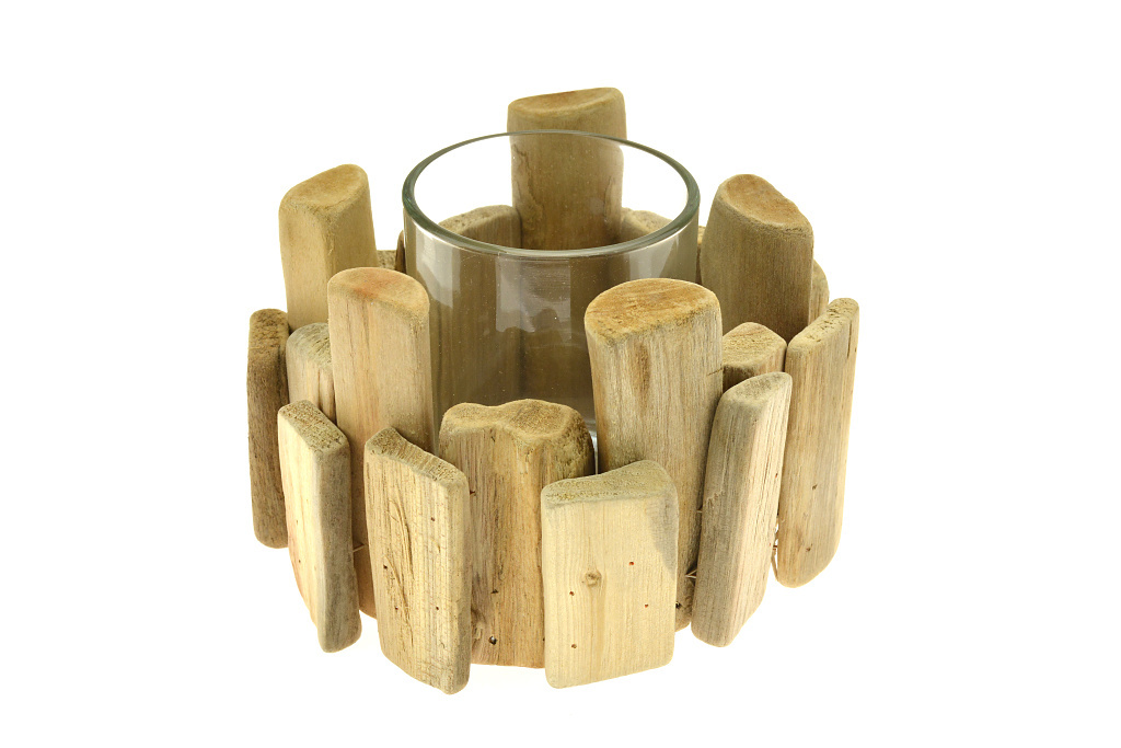 Dřevěný svícen se skleněnou nádobnou na svíčku. Tento svícen je vhodný pro dekorování umělým mechem, větvičkami jeřabin, umělým sněhem i dalšími floristickými dekoracemi, které najdete v naší nabídce.
