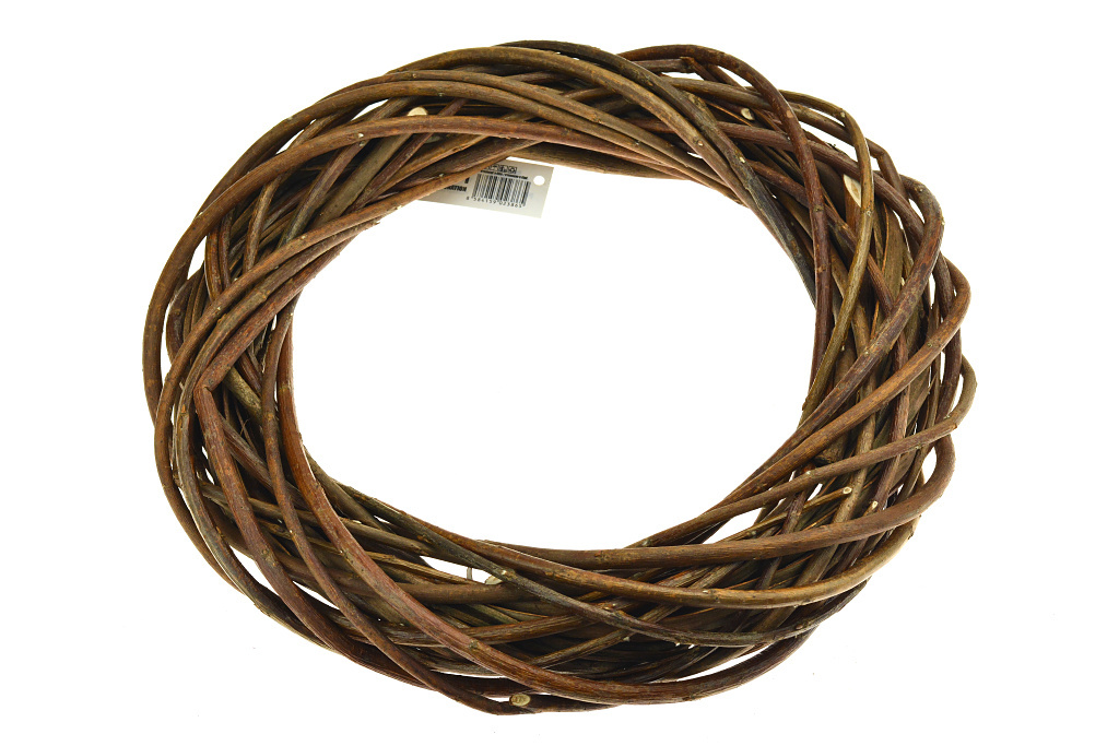 Proutěný věnec pro dekorování podle vlastní fantazie. Věnec je hnědé barvy a jeho průměr je přibližně 30 cm.