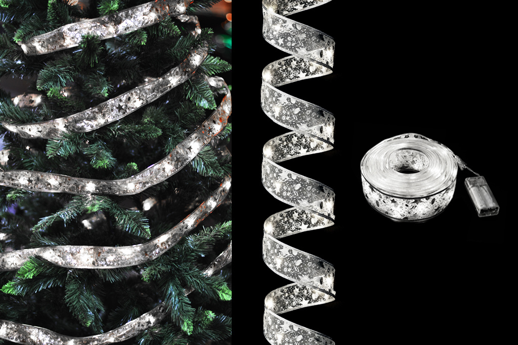 Vánoční stuha s LED světýlky 100cm 10LED - Stříbrná stuha/studená bílá