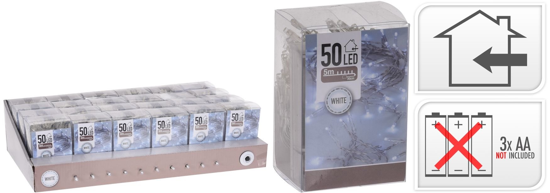 Vánoční světýlka - 50 LED žárovek. Barva žárovek - studená bílá. Pro vnitřní použití. Rozměry - délka 530 cm (500 cm kabel se žárovkami + 30 cm přívodní kabel). Baterie - 3x AA 1,5 V (nejsou součástí balení). číst celé