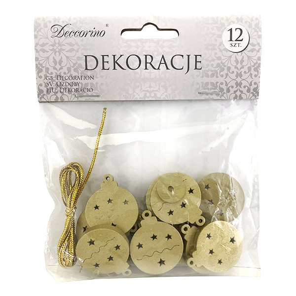 vyřezávané dřevěné ozdoby ve tvaru vánočních ozdobných koulí, barveno zlatou barvou.