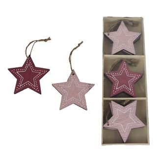 Sada dekoračních hvězdiček k zavěšení.Sada obsahuje 9 hvězdiček.Rozměry : 6,5 x 6,5 cm, tloušťka 0,4 cm.Barva : růžová.Materiál na bázi dřeva.