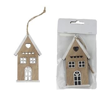 Sada dekoračních domečků k zavěšení.Sada obsahuje 2 domečky.Rozměry : 6,8 x 0,5 cm, výška 12,5 cm.Barva : kombinace přírodní s bílou.Materiál na bázi dřeva.