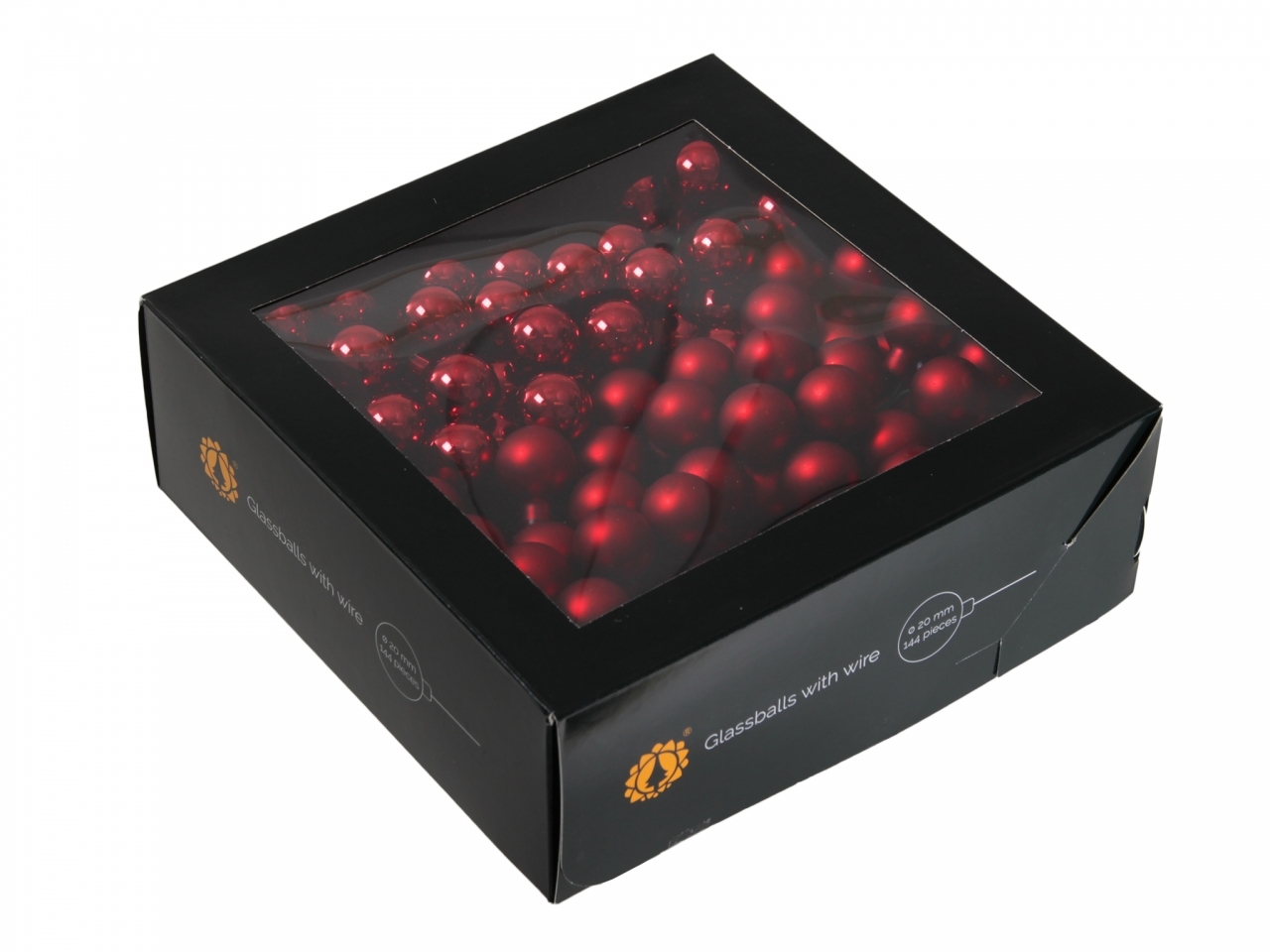 Sada 144 ks skleněných baněk s drátkem v barvě tmavě červené lesklé a matné.