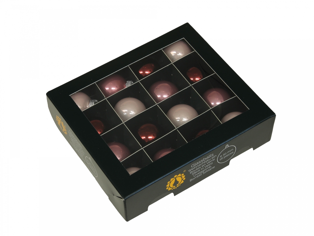 Sada 16 ks skleněných baněk v barvě divoký květ. V sadě jsou namíchané lesklé a matné baňky.