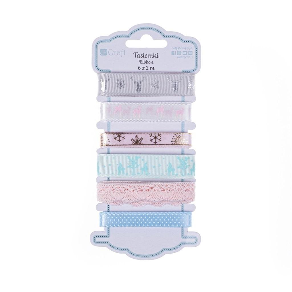 Zestaw satynowych i rypsowych tasiemek oraz koronek w pastelowych kolorach z motywami jelonków, drzewek i śniegu.