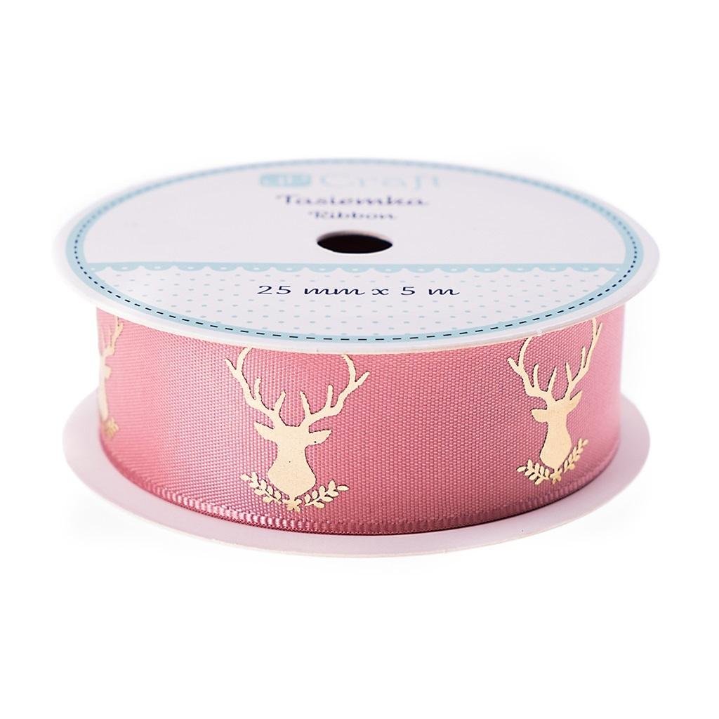 Satynowa tasiemka dekoracyjna w delikatnym różu ze złotym motywem głowy jelenia.
