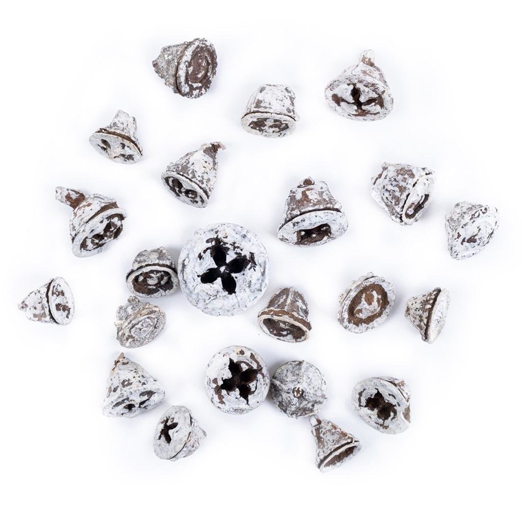 Suszone owoce eukaliptusa o charakterystycznym kształcie przypominającym dzwonki. Naturalne owoce zostały pokryte warstwą białej farby, która podkreśla nieregularną fakturę ich powierzchni.