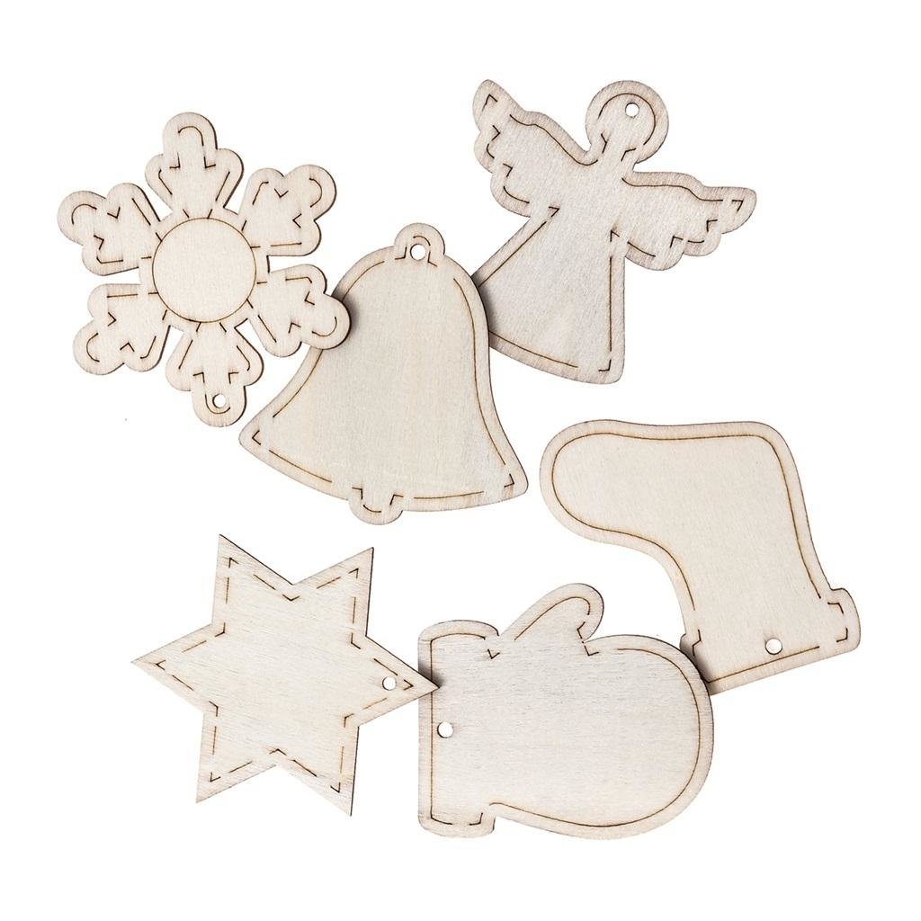Drewniane zawieszki w czterech, świątecznych wzorach: aniołka, dzwoneczka, śnieżynki, skarpety, gwiazdy i rękawiczki. Są doskonałą bazą do kreatywnych prac dla dzieci i dorosłych.