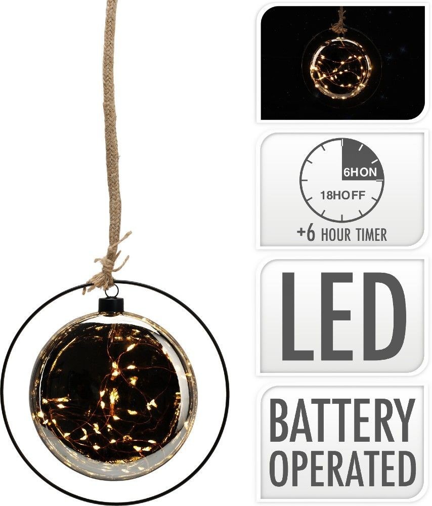 BALL FLAT, GLASS, SIZE: 18X5CM, WEIGHT: 205 GRAM, 40PCS COPPER LED METAL CABLE, BULB DISTANCE 5CM, BLACK METAL RING DIA 26CM, WITH ROPE LENGTH 80CM, INCLUDING TIMER FUNCTION, 3X AA BATTERIES NOT INCLUDED, COLOUR: SMOKE GREY, PACKED IN COLOURBOX/ 263X70X260MM, Colorbox + bubble foil (BBW-C) / CFT...