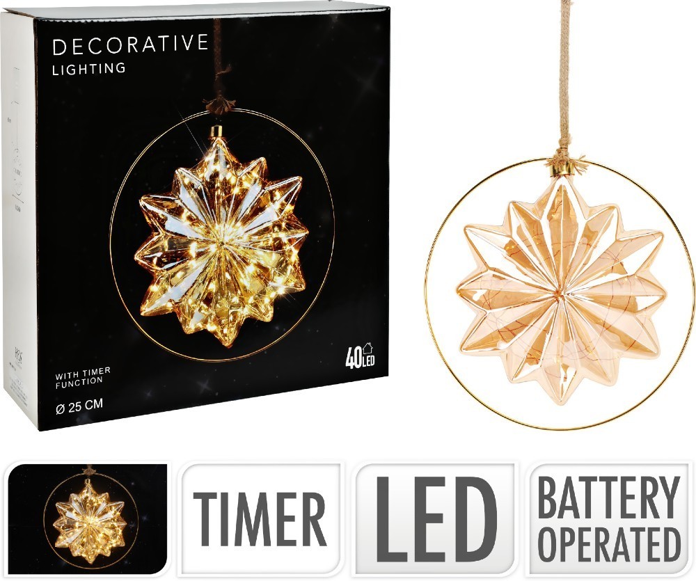 STAR, GLASS, SIZE: 18.5X8X21.5CM, WEIGHT: 210 GRAM, 40PCS COPPER METAL CABLE, BULB DISTANCE 5CM, GOLD METAL RING DIA 26CM, WITH ROPE LENGTH 80CM, INCLUDING TIMER FUNCTION, 3X AA BATTERIES NOT INCLUDED, COLOUR: AMBER, PACKED IN COLOURBOX/ 260X88X260MM, Colorbox + bubble foil (BBW-C): WEEE / CFT...
