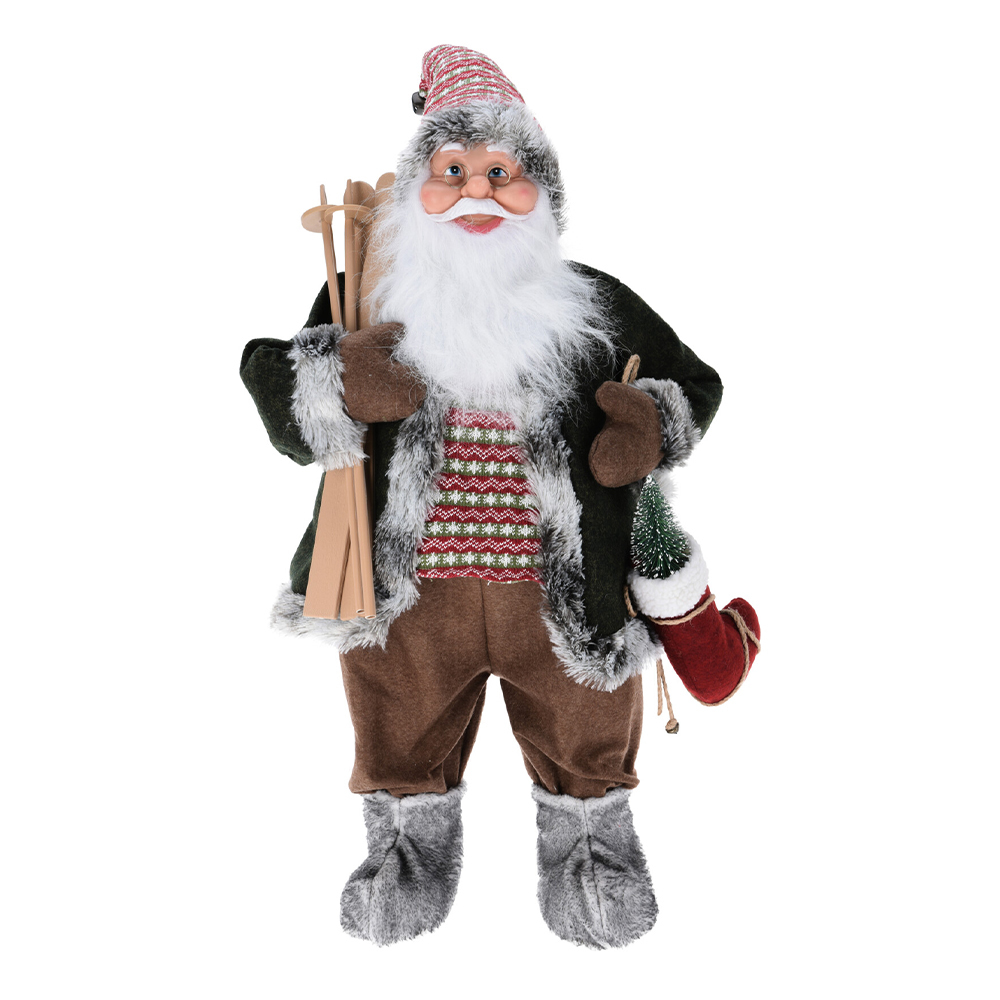 Mikuláš v zeleném kabátu s lyžemi a holemi a pletenou čepicí.