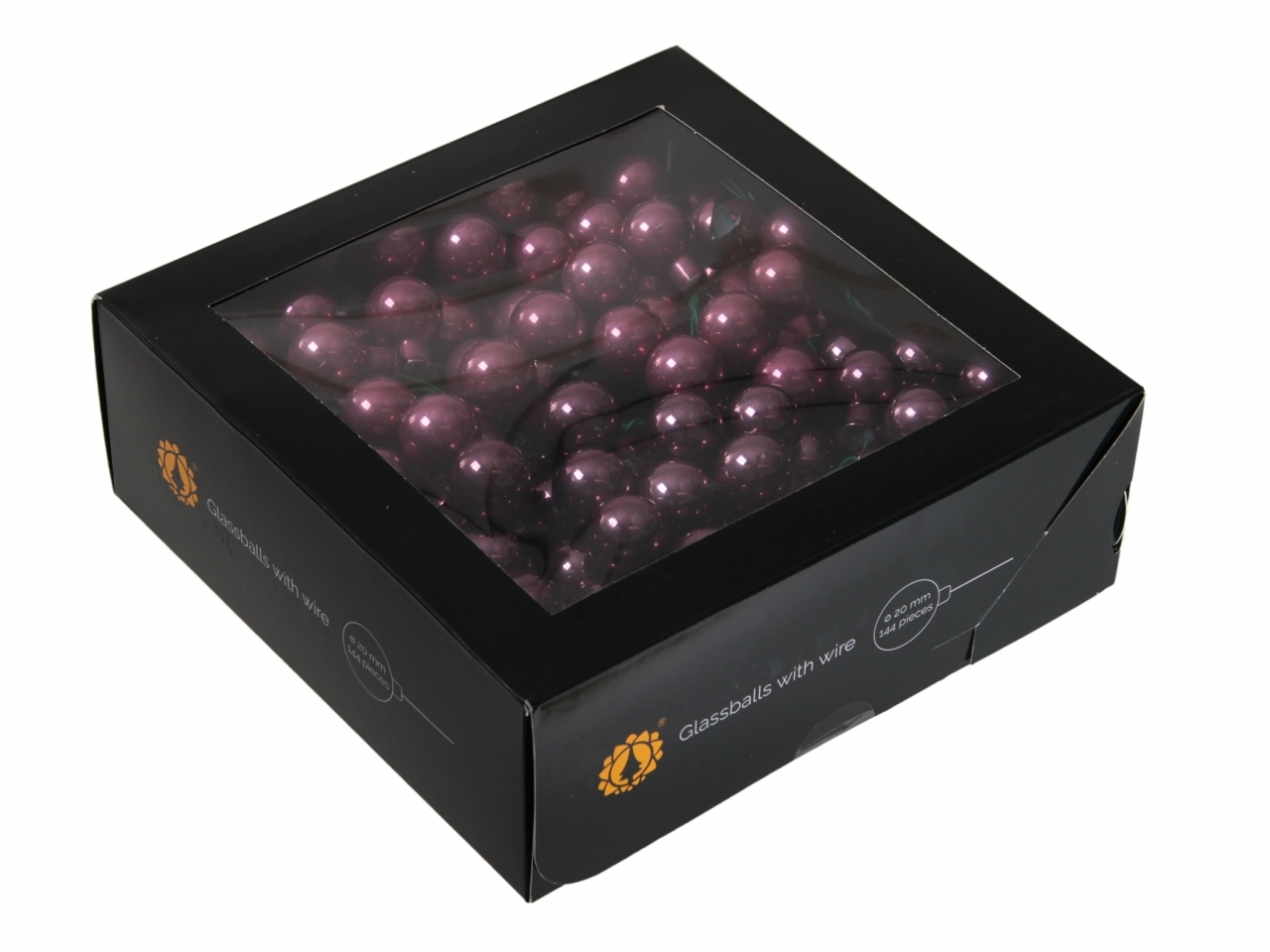 Sada 144 ks skleněných baněk s drátkem v barvě orchidej.