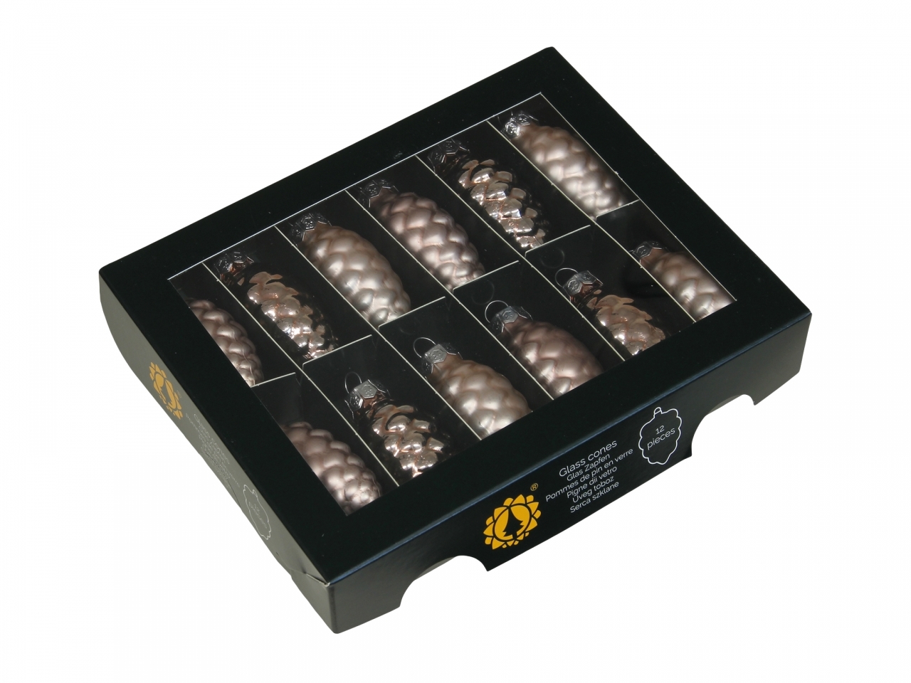 Sada 12 ks skleněných baněk - šišek růžových kouřových. V sadě jsou lesklé a matné šišky.