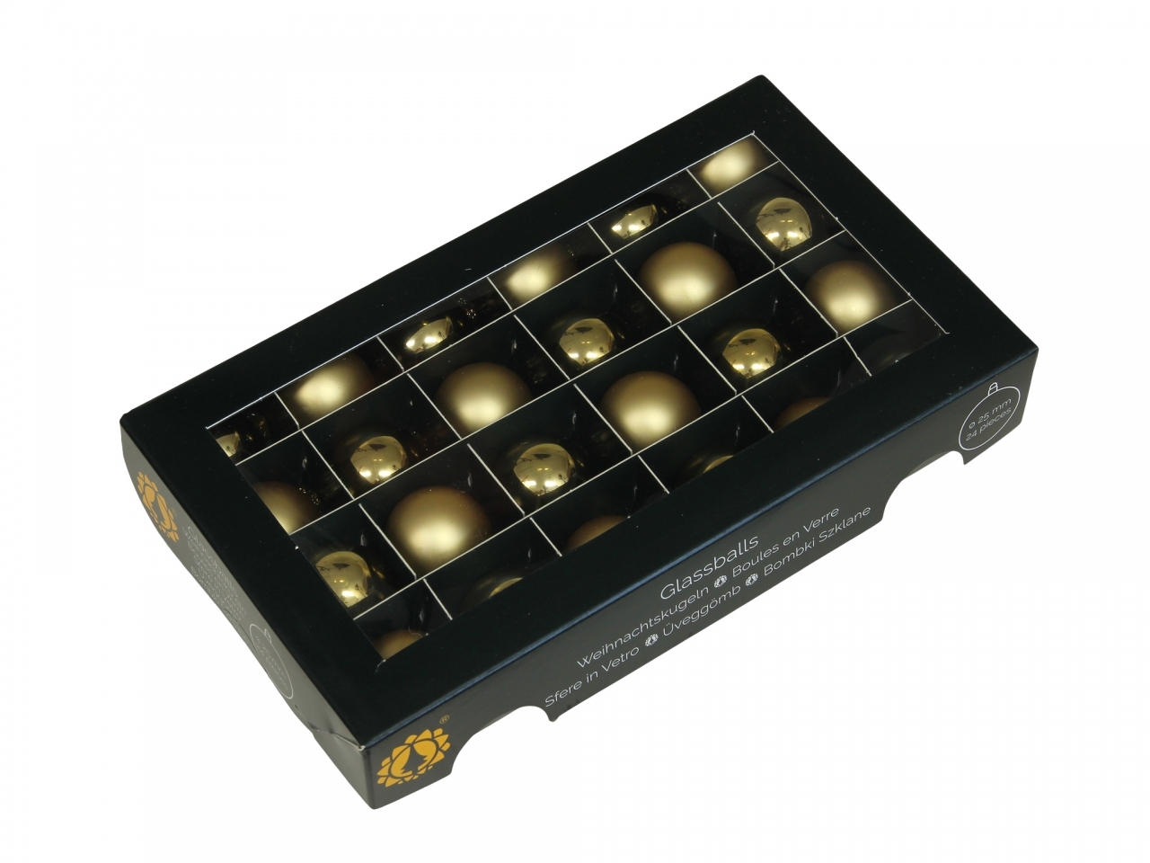 Sada 24 ks skleněných baněk v barvě světle zlaté. V sadě jsou namíchané lesklé a matné baňky.