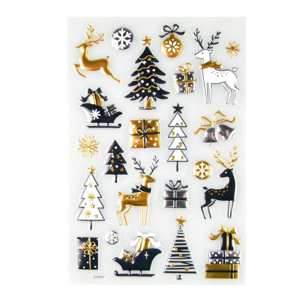 Zestaw naklejek 3D glamour w zimowe i świąteczne wzory. Bożonarodzeniowe wypukłe naklejki w kolorach złota, czerni oraz bieli. Zestaw samoprzylepnych naklejek do prac kreatywnych, kartek świątecznych, prac szkolnych. Wymiary blistra to 25x14,5 cm. W opakowaniu znajduje się 1 blister.