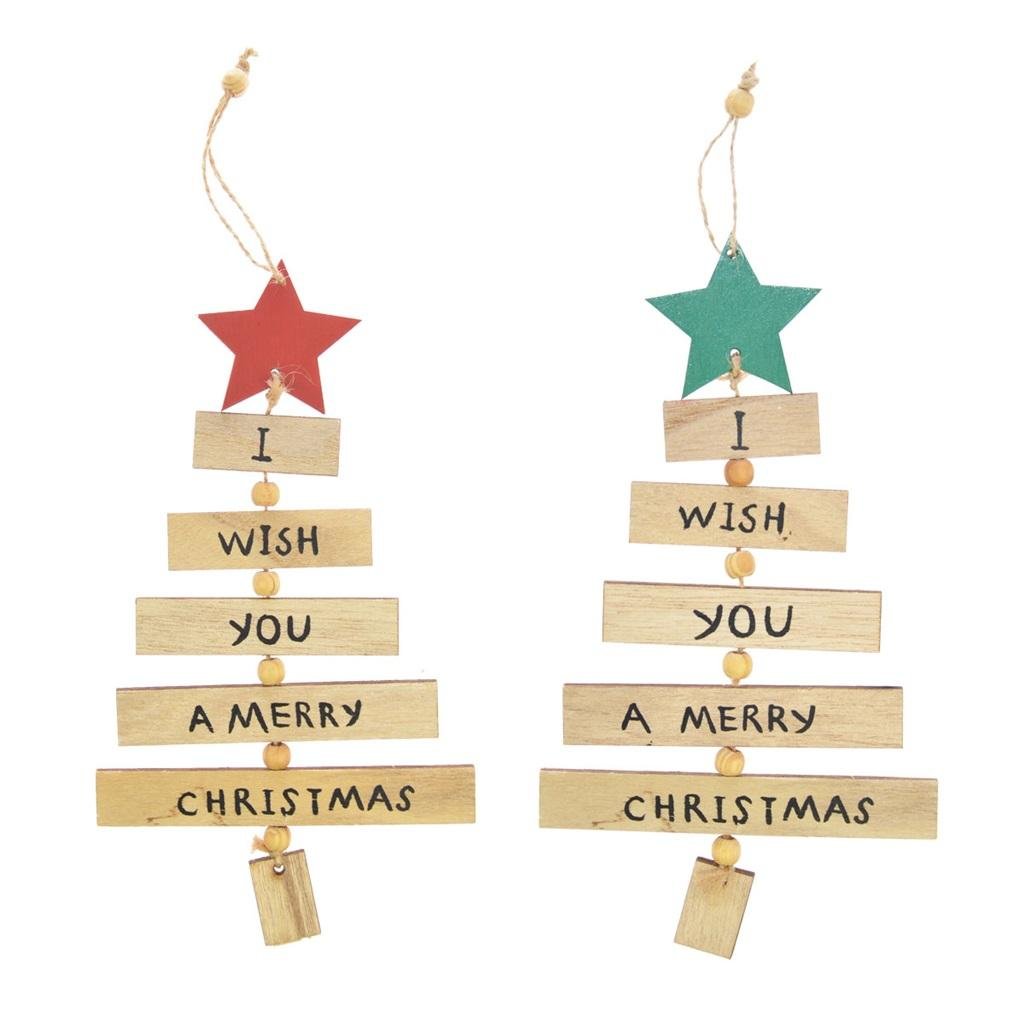 Dekoracja wisząca - drewniana choinka. Dekoracja składa się z segmentów połączonych sznureczkiem. Na dekoracji widnieje napis