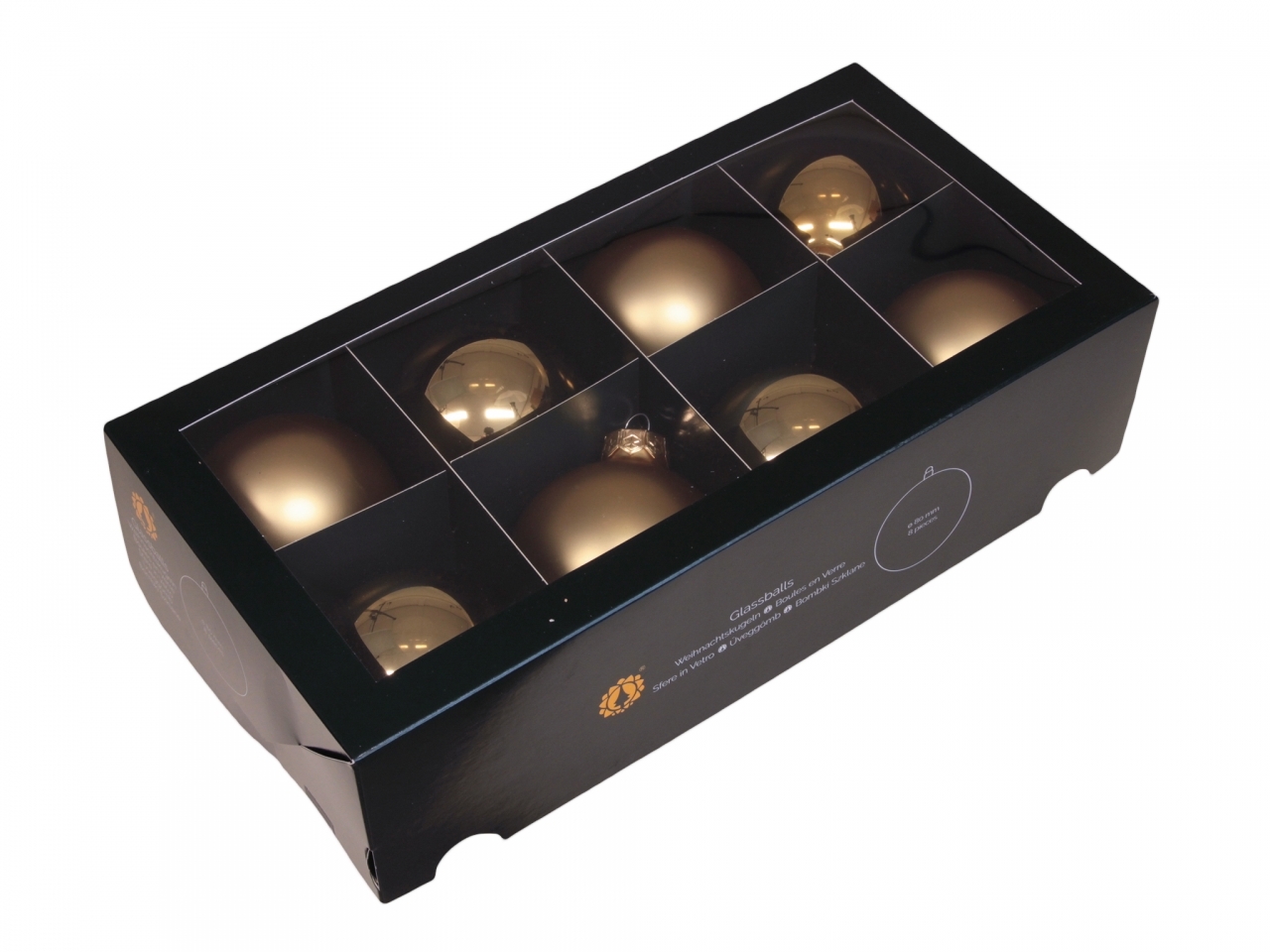 Sada 8 ks skleněných baněk v barvě světle zlaté. V sadě jsou namíchané lesklé a matné baňky.