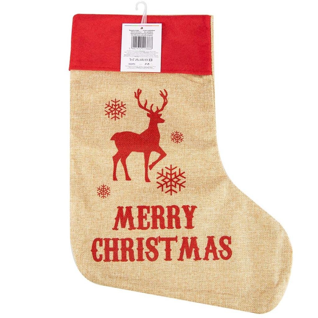 Jutowa skarpeta z czerwonym nadrukiem renifera i napisem "Merry Christmas". Wielkość 45 cm. číst celé