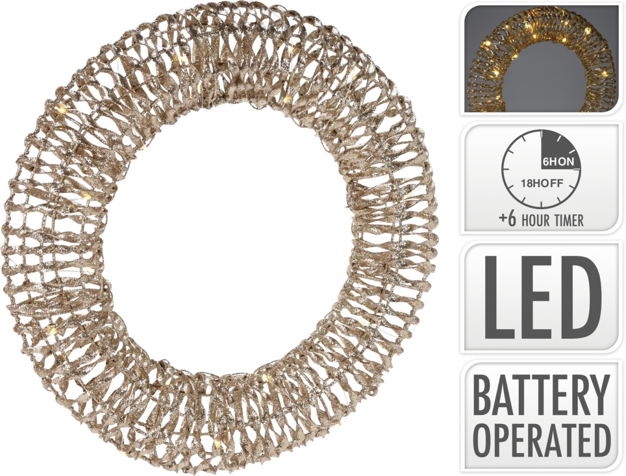 Kovový věnec s 30 LED diodami teplé bílé barvy a zlatými glitry. Napájení 3x AA bateriemi (nejsou součástí výrobku). Součástí adaptéru IP20 časovač 6/18 h. Délka přívodového kabelu 150 cm.