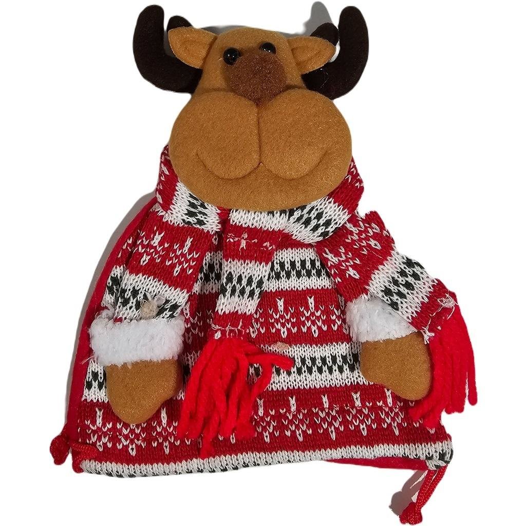 RENIFER z wełny o wymiarach 16x25cm, w kolorze biało-czerwonym, spełniający formę woreczka na prezent, zapakowana w torebkę foliową