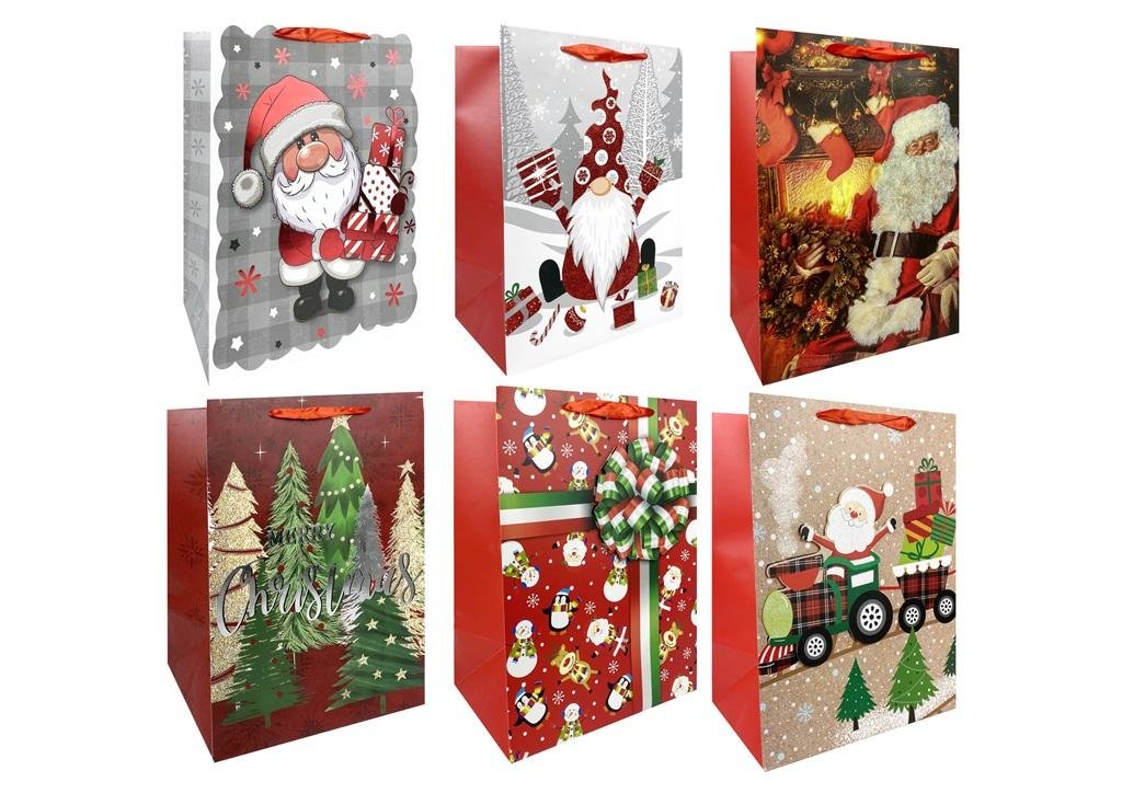 Torebka prezentowa ze świąteczną grafiką. Gramatura papieru 210, torebka laminowana folią mat z dodatkowym uszlachetnieniem (typu brokat/złocenie/srebrzenie/efekt 3D). Pakiet 6 wzorów po 2 sztuki. Wielkość: 300x415x200 mm (L-20) Szerokie dno - 20 cm číst celé