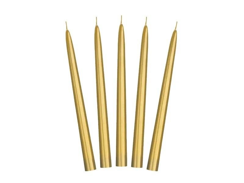 Świeca stożkowa metalizowana w kolorze złotym, wysokość 24 centymetry. Czas palenia 1 sztuki około 5 godzin.