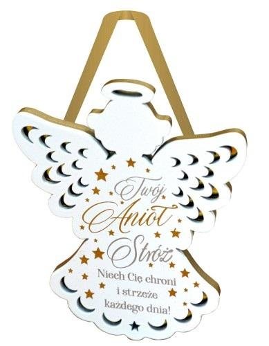 Zawieszka od serca w formie Aniołka to niezapomniany pomysł na prezent na Boże Narodzenie. Wykonana z solidnej płyty MDF z wyżłobionymi lustrzanymi zdobieniami i napisami z krótką sentencją Na tylnej ściance Aniołka jest tasiemka do zawieszenia na ścianie. Cechy szczególne: typ: zawieszka do powieszenia wielkość orientacyjna: wysokość: 14 cm, szerokość: 12,5cm (skrzydła), grubość: 7mm zdobienie: wzory wyżłobione w drewnie z lustrzaną folią, kolorowy napis okazja: Boże Narodzenie