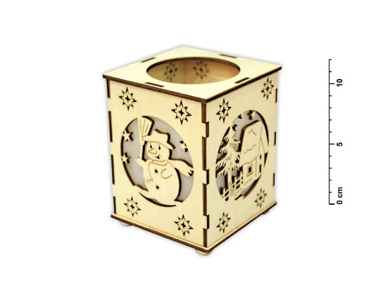 Vánoční dřevěný svícen s vyřezaným sněhulákem. Uvnitř svícnu je skleněná miska na čajovou svíčku. Stačí ji vložit, zapálit a užívat si vánoční čas.