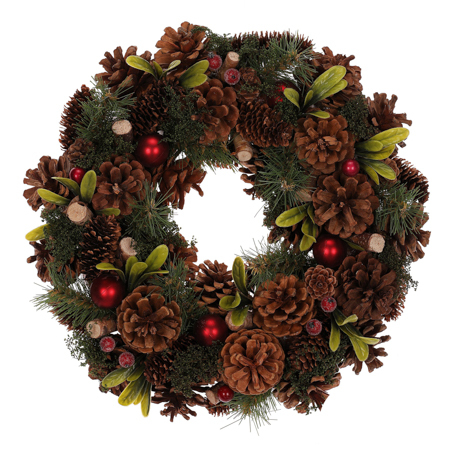 Obohaťte váš interiér v adventním i vánočním čase tímto nádherným zdobeným věncem o průměru 35 cm. Najdete na něm pravé borovicové šišky, umělé jehličí a zelené lístky, což přinese do vašeho prostoru úžasný přírodní prvek. Doplněný červenými bobulemi a koulemi, spolu s drobnými okrasnými dřívky, vytváří věnec působivou vánoční atmosféru. Je vhodný jak na pověšení na zeď či dveře, ale taktéž i na ozdobu stolu. A jelikož je umělý, můžete se těšit na to, že vám vydrží po celé vánoční období, i mnoho dalších.