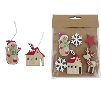 Sada vánočních přízdob k zavěšení.Sada obsahuje 6 přízdob.Rozměry : 3 - 4,5 x 0,5 cm, výška 3 - 5,8 cm.Barva : kombinace hnědá, červená, bílá.Materiál na bázi dřeva.
