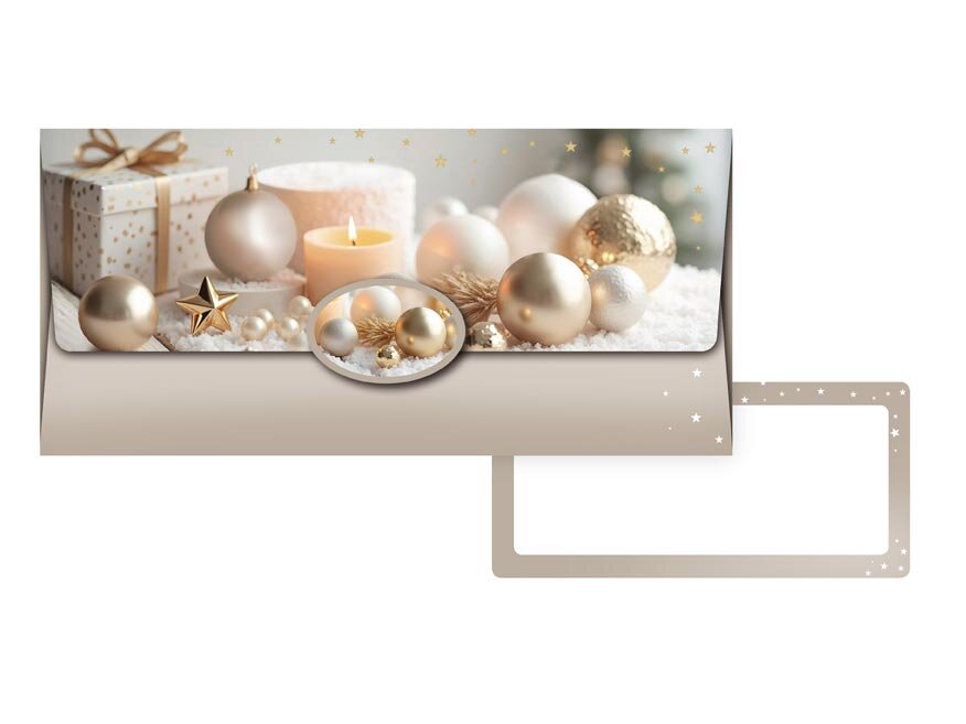 Tato elegantní obálka na peníze vnese do vašeho dárku noblesu a slavnostní atmosféru. Kombinace zlatých a perleťových ozdob, jemné světlo svíčky a decentní pozadí vytvářejí harmonický motiv plný klidu, tepla a očekávání. Obálka je ideální pro předání peněz, dárkového poukazu nebo osobního přání během vánočních svátků.