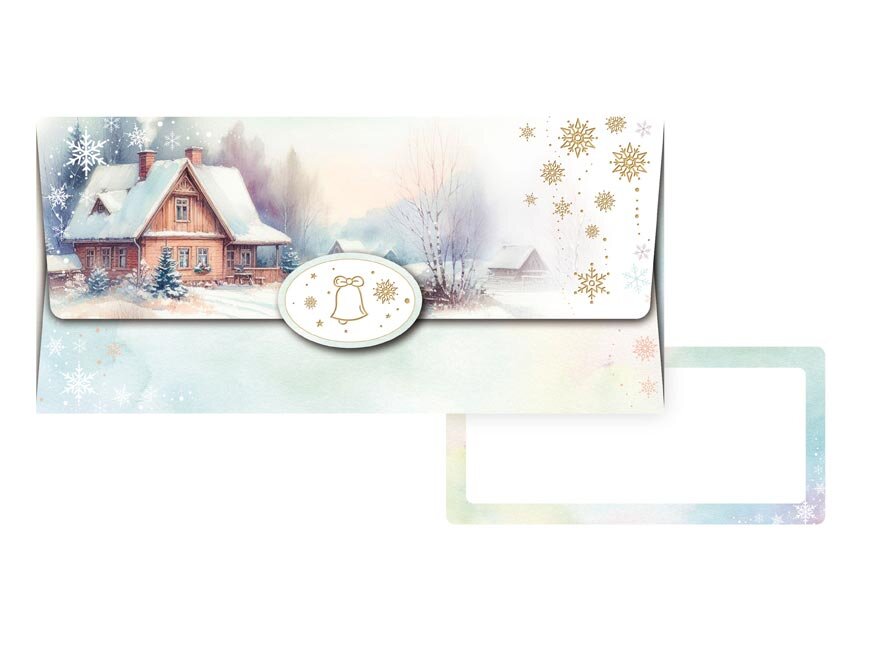 Vdechněte svým vánočním dárkům kouzlo tradice a elegance. Tato vánoční obálka s motivem zasněžené chaloupky a zlatými sněhovými vločkami je ideální pro slavnostní předání peněz, dárkového poukazu nebo vstupenek.
