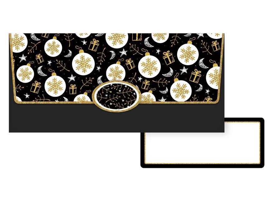 Obálka na peníze vánoční ozdoby - černá je ideálním doplňkem pro vaše vánoční dárky. Zdůrazněte své přání originálním a praktickým balením, které potěší každého obdarovaného. Díky soběstačnému designu s uzavíratelnou klopou snadno vložíte peníze nebo dárkový poukaz, aniž byste museli řešit další balící materiál.