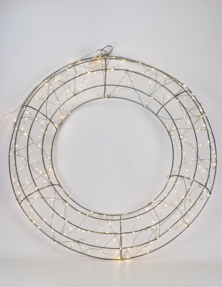 Bílý kovový věnec s LED osvětlením. Napájení adaptérem se stupněm krytí IP44 - poskytuje základní ochranu pro použití zařízení ve venkovních prostorech. Počet mikro LED diod 300 ks.