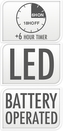 Kovový strom se zlatými glitry a 15 LED diodami. Napájení na 2x AA tužkové baterie (nejsou součástí výrobku). Součástí adaptéru je časovač 6/18 h.