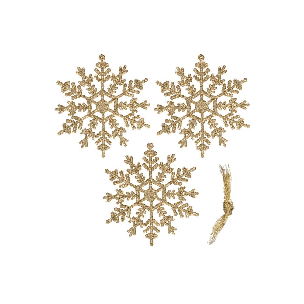 Sada tří kusů sněhových vloček s provázkem na zavěšení. Výška 12 cm, blýskavý povrch se třpytkami, nerozbitný plastový materiál, zlatá barva. Ideální k výzdobě stromečků nebo jako vánoční dekorace.