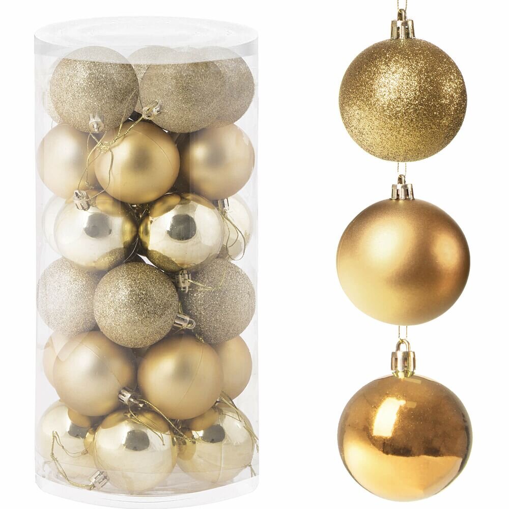 Sada obsahuje 30 ks baněk o průměru 6 cm, které jsou ideální velikosti pro jakýkoliv stromeček. Zlatá barva dodává ozdobám nadčasový vzhled a díky různorodým vzorům působí dekorace zajímavě a živě, čímž zvyšují estetickou hodnotu celého vánočního stromku. Vánoční baňky lze snadno zavěsit a skvěle se kombinují s dalšími ozdobami.