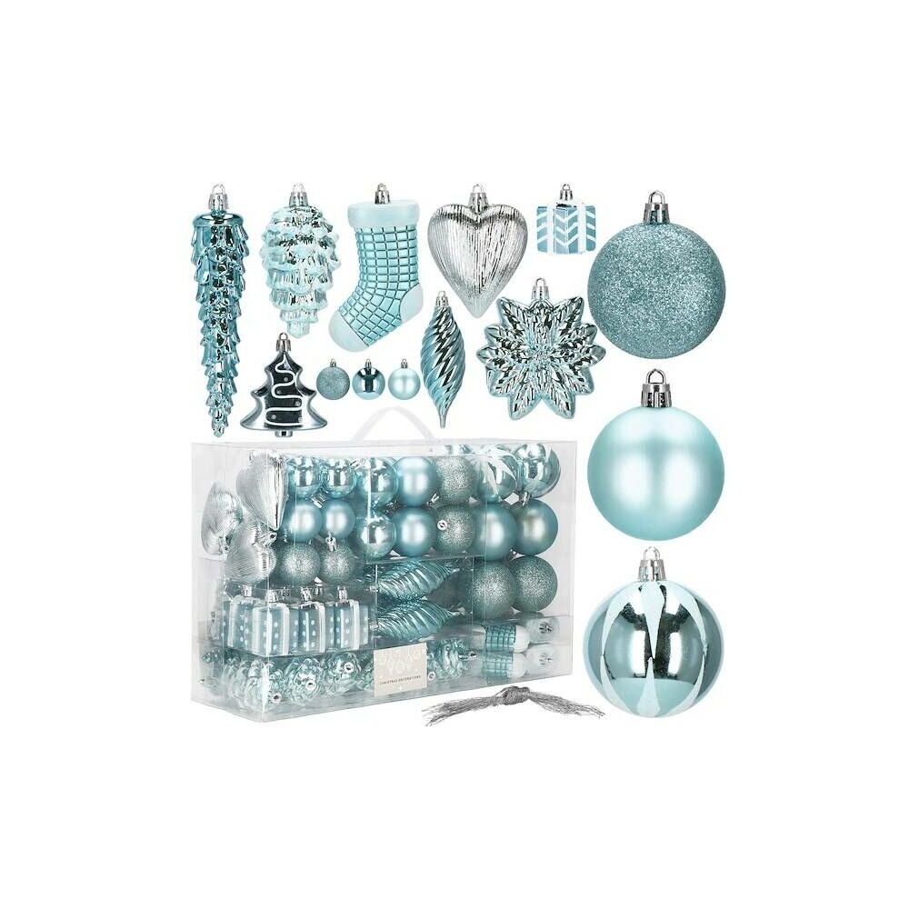 Luxusní 72 dílná sada vánočních ozdob na stromeček. Set tvoří 17 různých vzorů ozdob světle modré barvy.