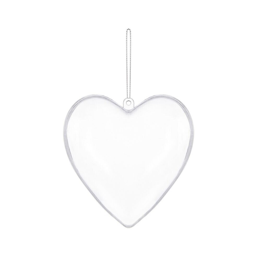 Průhledná plastová baňka ve tvaru srdce s možností vytvoření originální ozdoby. Ozdobte si vánoční baňku na stromeček dle svých představ. Průměr 12 cm, nerozbitný plastový materiál, poutko a provázek na zavěšení.