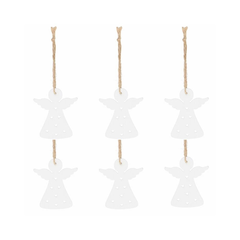 Sada 6ks dřevěných ozdob s provázkem na zavěšení. Vzor andělíček, výška 6,5 cm, přírodní materiál, krásné zdobení. Ideální k výzdobě stromečků nebo jako vánoční dekorace.