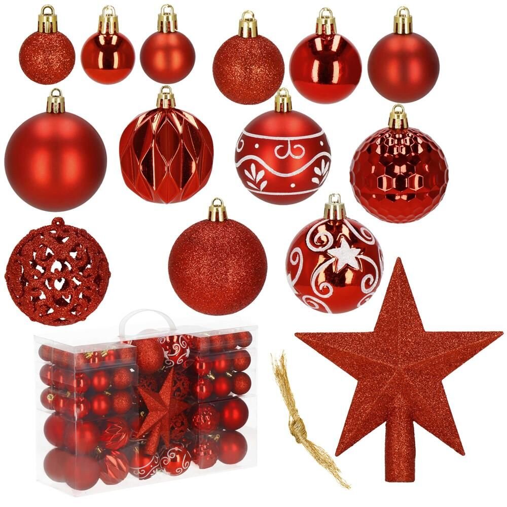 Luxusní 101 dílná sada vánočních ozdob na stromeček. Set tvoří 2 různé vzory ozdob červené barvy + překrásná hvězda na špičku stromku. Vše z nerozbitného plastového materiálu. Ideální k výzdobě stromečku nebo jako vánoční dekorace. Zdarma provázky pro snadné zavěšení.