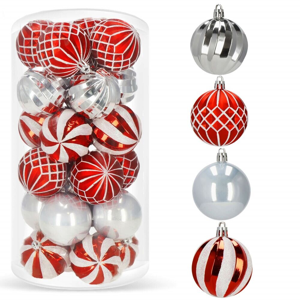 Sada 24 ks červeno-stříbrných baněk na stromeček se třemi různými vzory. Průměr baňky 6 cm, poutko na zavěšení, nerozbitný plastový materiál. Kouzelné jako vánoční ozdoba k zavěšení na stromeček nebo jako vánoční dekorace. Zdarma provázky pro snadné zavěšení.